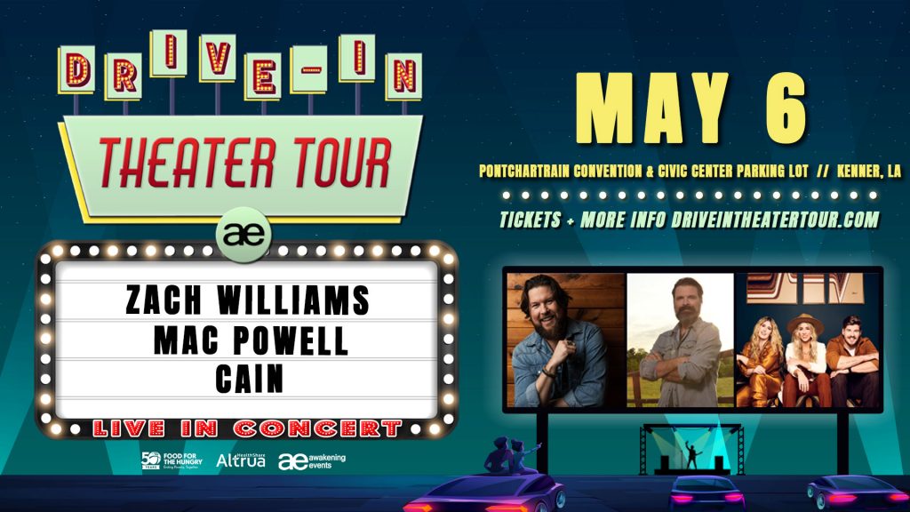 Who is ready for a show!? Thursday, May 6th at the Pontchartrain Center (parking lot) in Kenner – Zach Williams, Mac Powell and Cain! It’s the Drive-In Theater Tour! Bring up to six people per car with your blankets and lawn chairs for a night of LIVE MUSIC AND FUN under the stars!